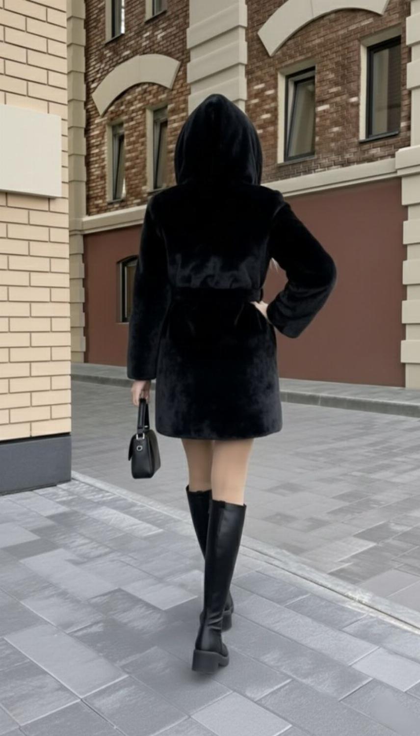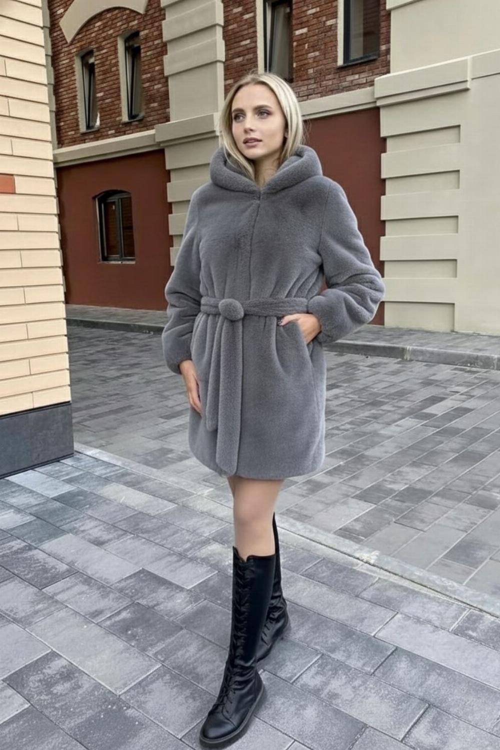 Стильна коротка еко-шуба з капюшоном та поясом під песця "Leona"