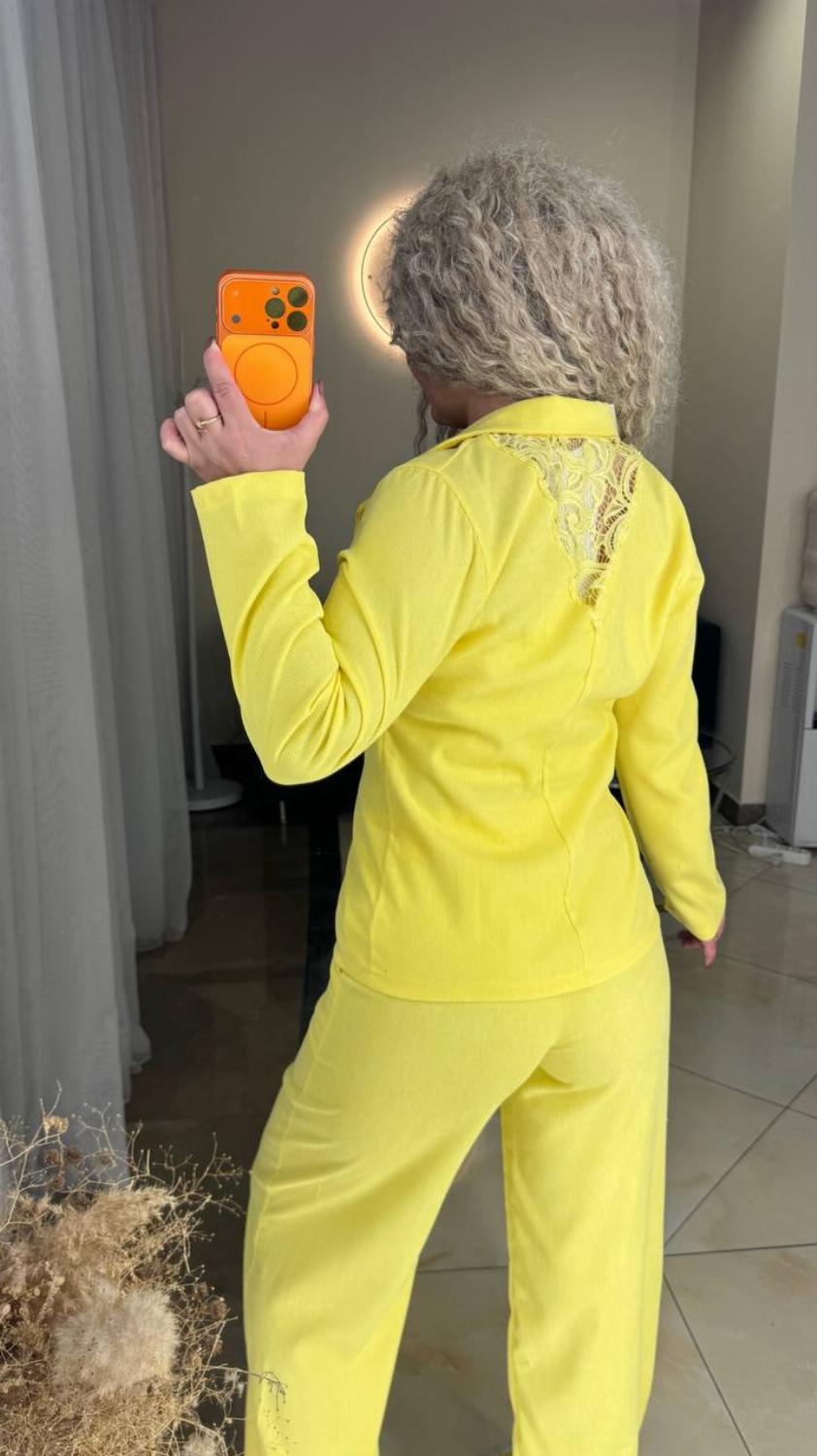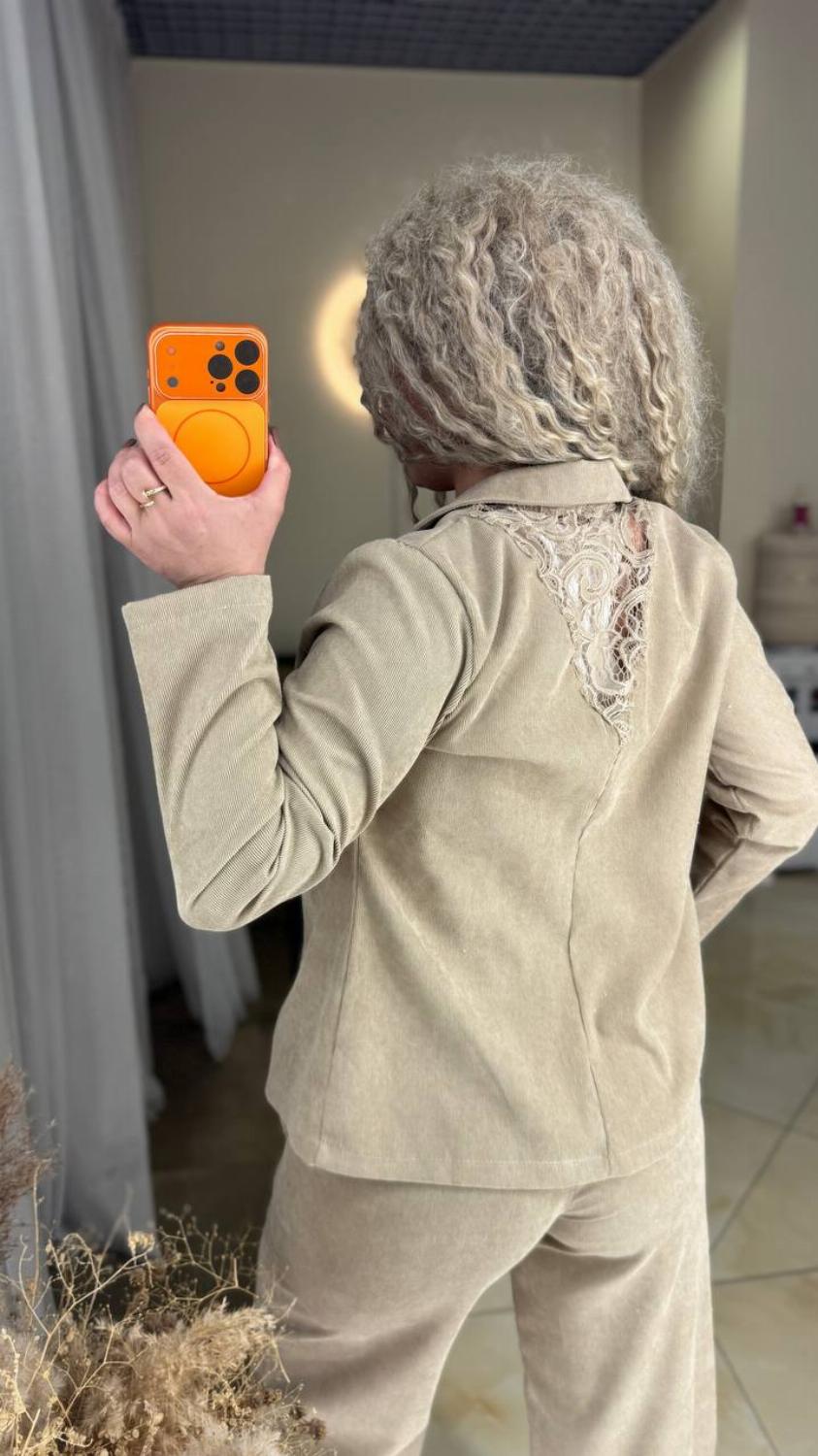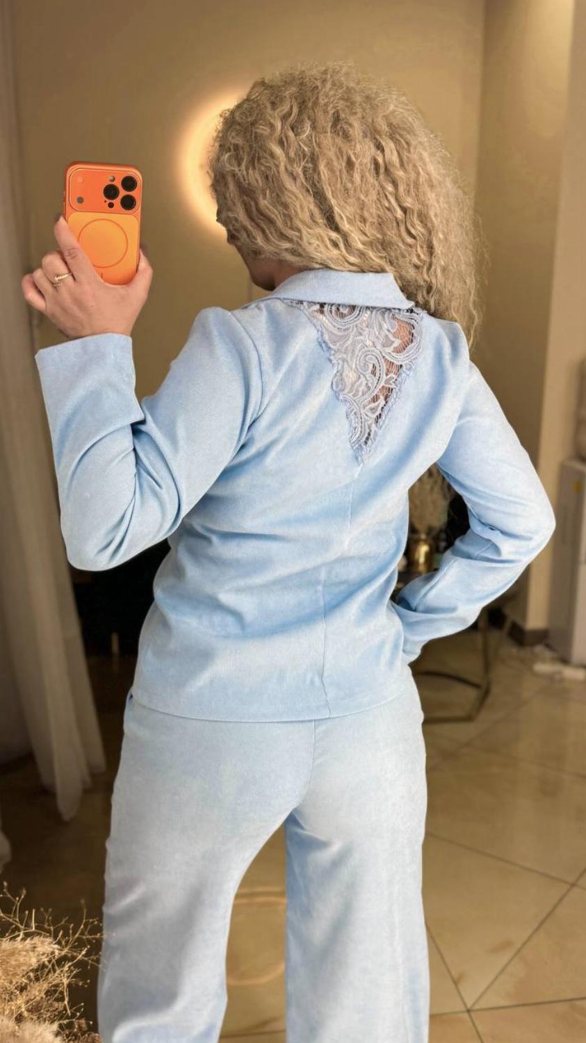 Родзинка образу: Елегантне мереживо на спинці жакета, що робить ваш образ незабутнім з будь-якого ракурсу.