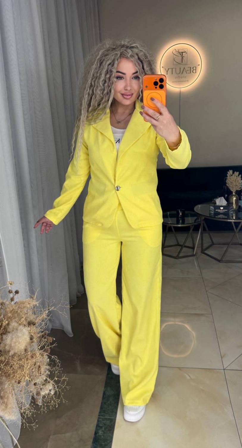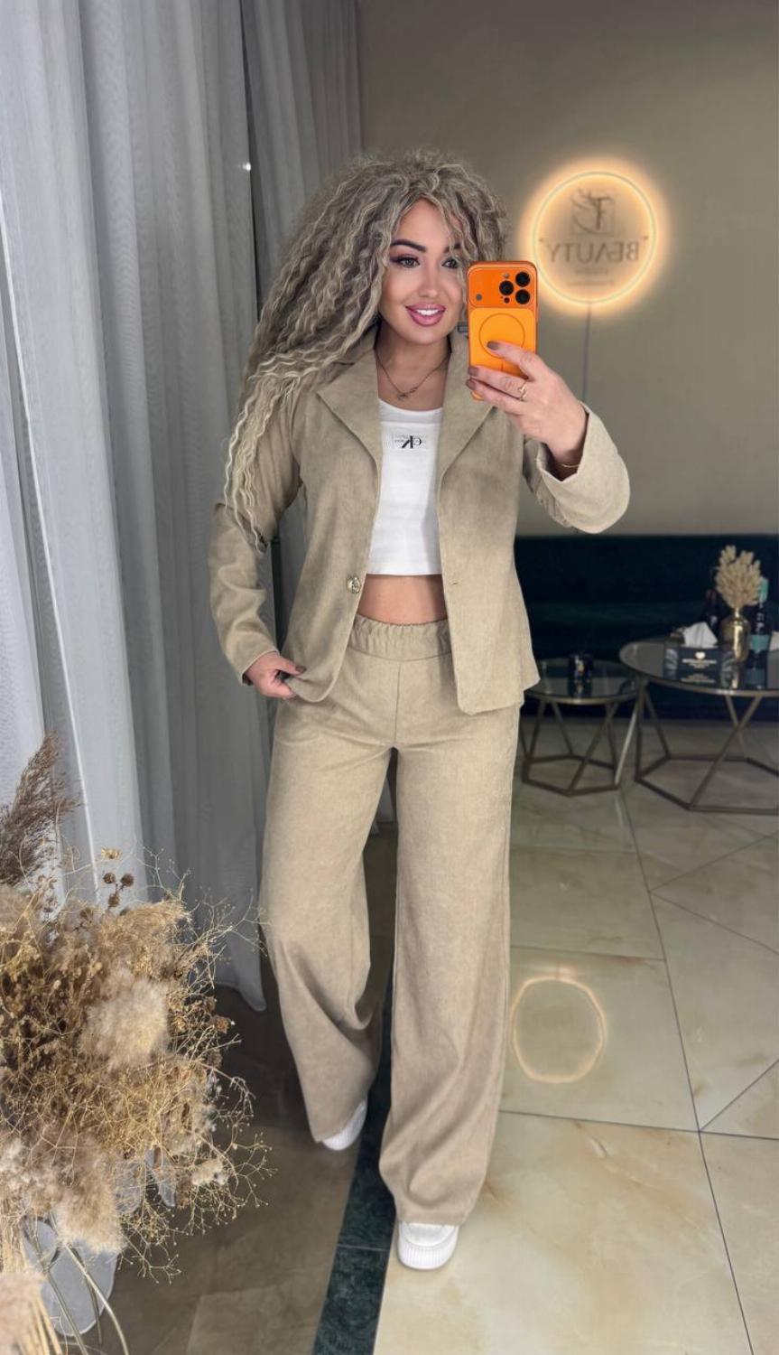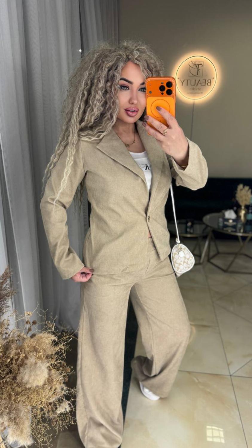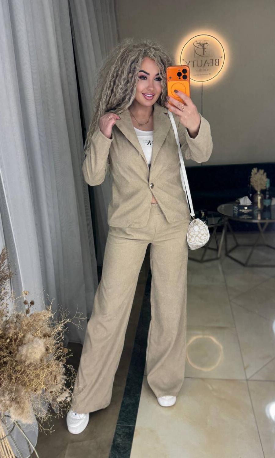 Фасон: Широкі штани палаццо та вільний піджак створюють сучасний та легкий силует.
