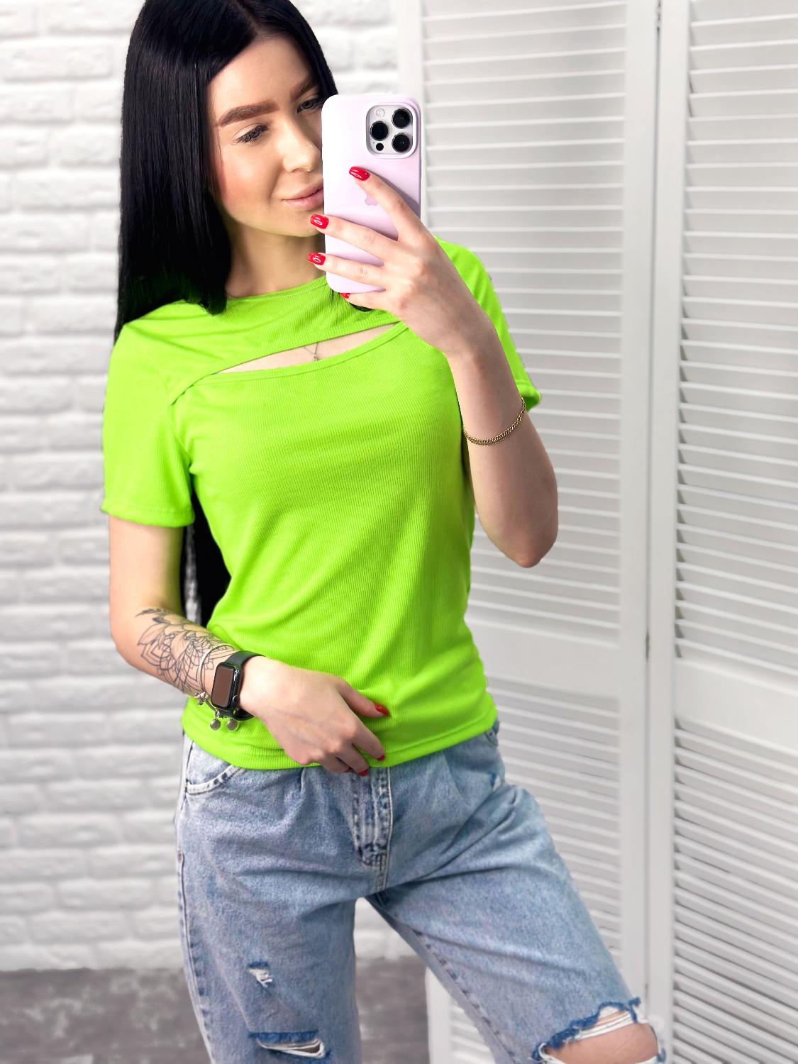 Однотонна футболка представлена у трьох відтінках – базових чорному, ніжному білому та теплому мокко. Оригінальний розріз на грудях зробить образ неординарним, але не покаже нічого зайвого. Трикотаж у рубчик приємно відчувається на тілі і не парить навіть у спеку. У прохолодні вечори можна доповнити образ легкою курткою або вітровкою з екошкіри.