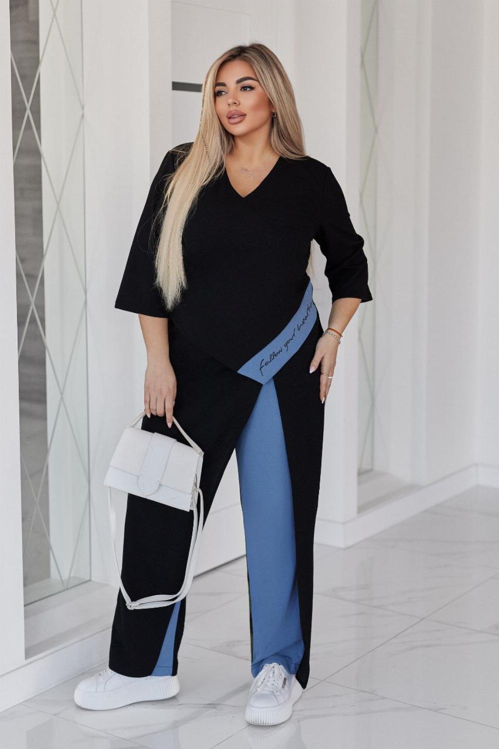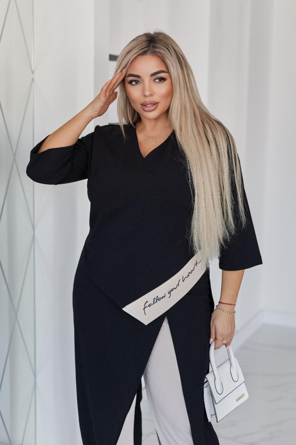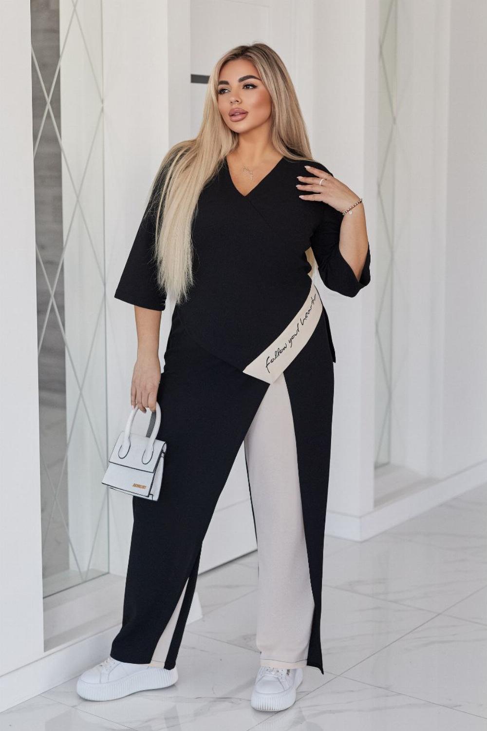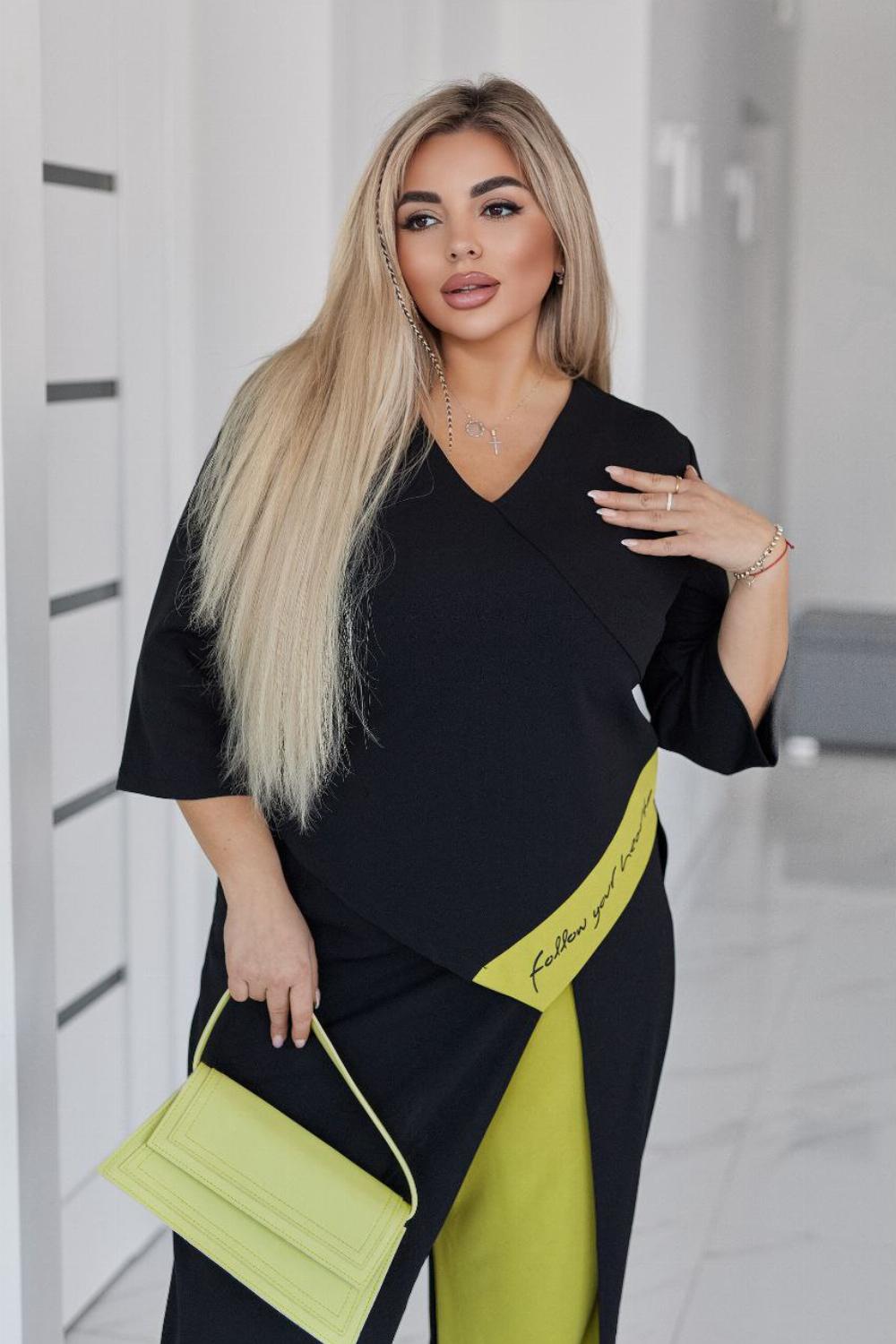 Дизайн: Незвичайна асиметрія верху та ефектний розріз на спідниці-штанах створюють сучасний, легкий образ. Контрастні вставки додають яскравості, залишаючи вигляд елегантним.