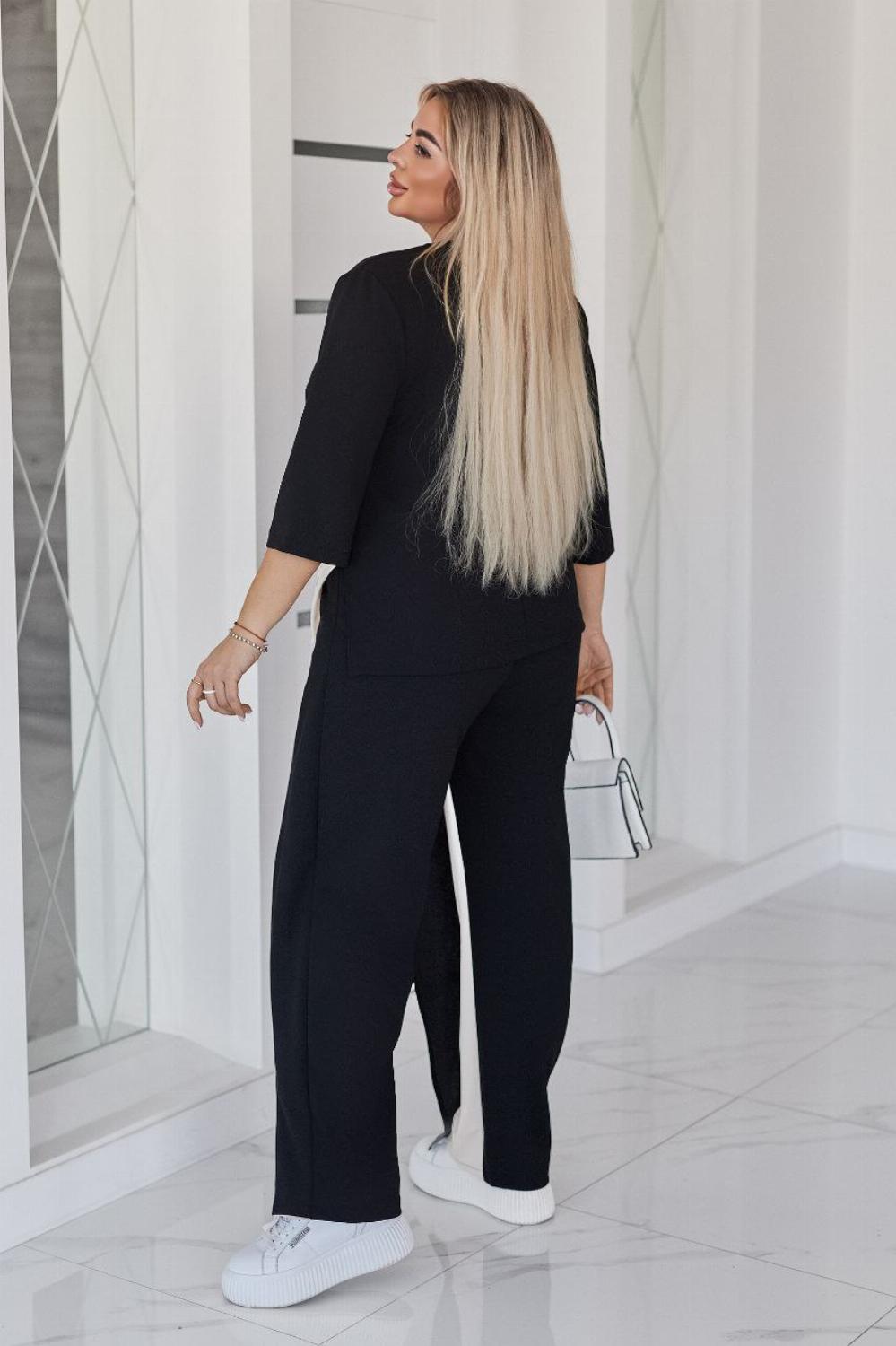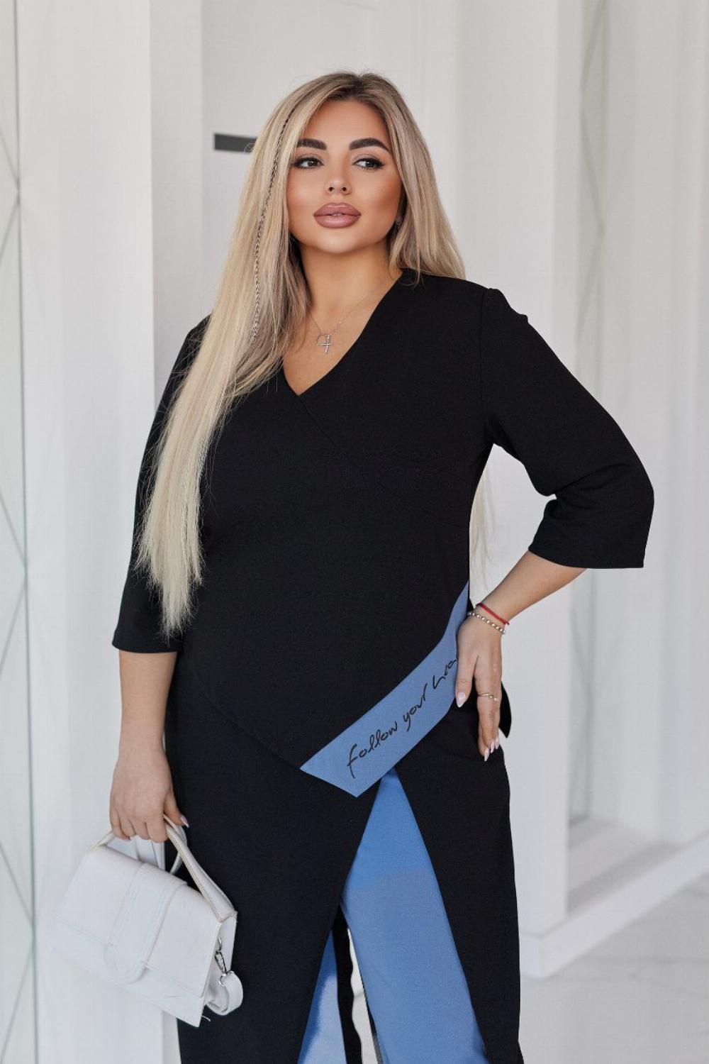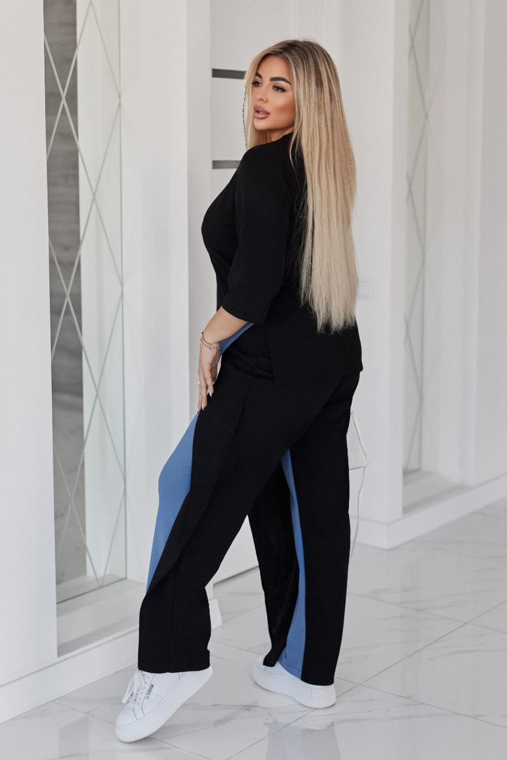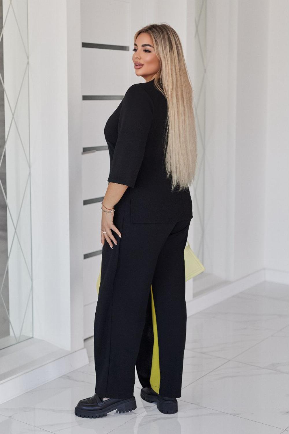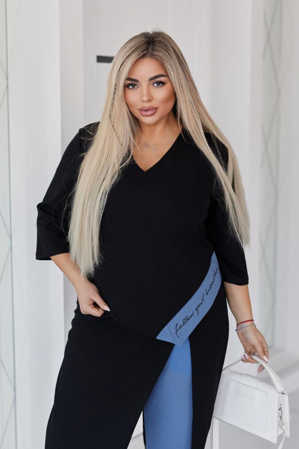 Дизайн: Незвичайна асиметрія верху та ефектний розріз на спідниці-штанах створюють сучасний, легкий образ. Контрастні вставки додають яскравості, залишаючи вигляд елегантним.